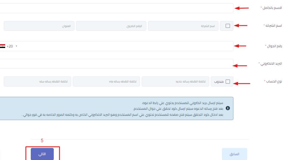 4- ادخل البيانات المطلوبة للمستخدم الذي ترغب في تسجيل حسابه، ثم اضغط على (التالي).